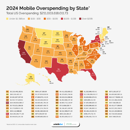 Did you know that 1 in 4 Americans can’t comfortably afford their monthly mobile plan? In WhistleOut’s annual report, we partnered with Mint Mobile to find out how much people are paying – or overpaying – to stay connected and found that residents of your state are wasting an estimated $4,411,032,600 a year on their cell phone plans: