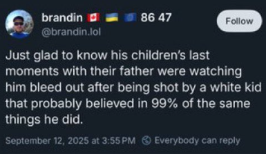 No matter what side of the isle you’re on, no one deserves to be murdered for sharing their beliefs & reaching out for discussion. Charlie Kirk was a 31 year old Husband & Father with 2 young kids and a young amazing Wife who will now have to resort to pictures & videos for memories.