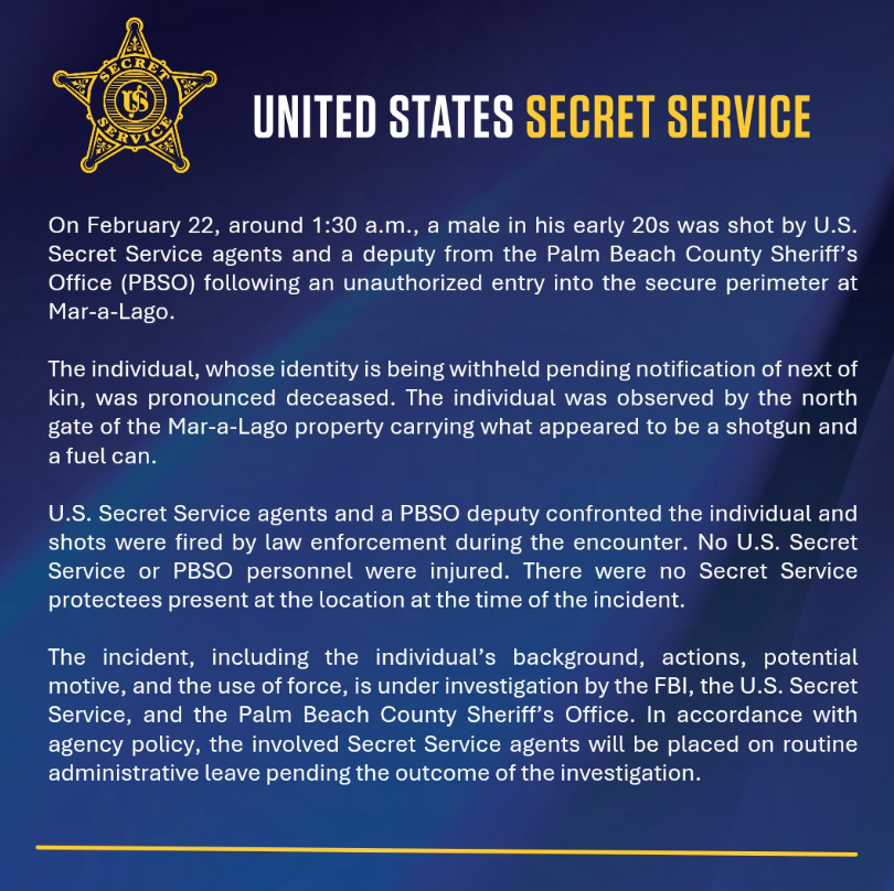An armed man was shot & killed by U.S. Secret Service agents & @PBCountySheriff after unlawfully entering the secure perimeter at Mar-a-Lago early this morning. A press briefing with additional details will be held at 9:00 a.m with @FBI and Palm Beach County. pic.twitter.com/jAXhdb1xEL