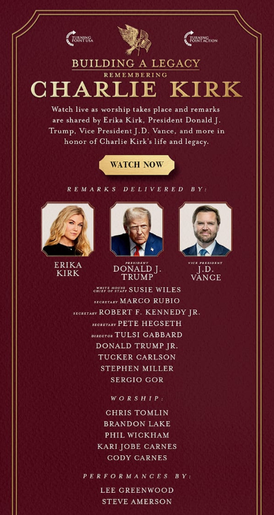 On Sunday, September 21st the legendary Charlie Kirk was honored by the top officials in the United States Government & by MAGA + Turning Point supporting & beloved Patriots at State Farm Stadium in Glendale, Arizona.